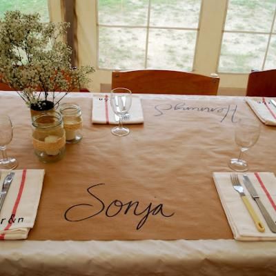 Если тарелки белые или с каймой, можно красиво нарисовать место тарелки, столовых приборов, бокалов. Сделать это можно баллончиком с краской, гуашью, фломастерами и белым фломастером для стекла: